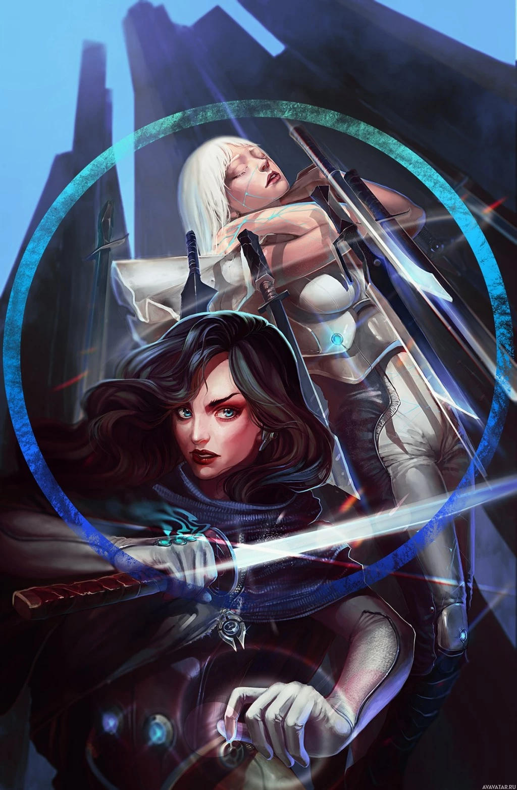 long hair, wearing a cloak and also wielding a sword. They are both depicted in