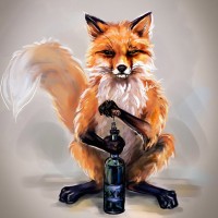 На картине изображена иллюстрированная лиса, сидящая вертикально и держащая бутылку в лапах. Лиса, по-видимому, антропоморфизирована, так как она имеет человеческие черты, такие как руки, которые держатся за бутылку. Он не связан с текстом или другими элементами за пределами бутылки.