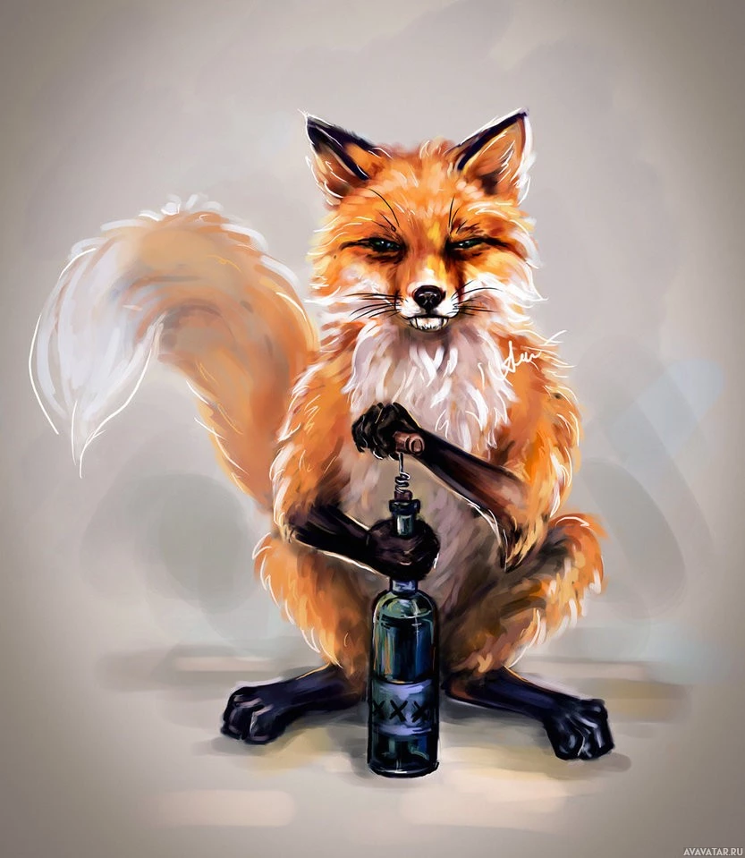 In the picture, there is an illustrated fox sitting upright and holding a bottle in its paws. The fox appears to be anthropomorphized, as it has human-like features such as hands that are holding onto the bottle. It is not engaged with any text or other elements beyond the bottle.