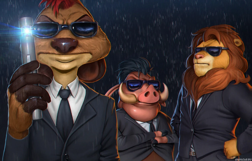 human attire and accessories, such as suits and sunglasses, which gives them a stylized appearance that deviates from their traditional animal forms seen in the movie. The background suggests an urban or industrial setting under artificial lighting, adding