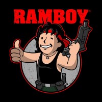 character in the game. He is depicted holding a gun and giving a thumbs-up gesture, which is typically associated with approval or satisfaction. The background includes text that says "Rambo" and "© Bethesda Softworks LLC," indicating