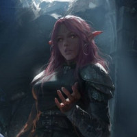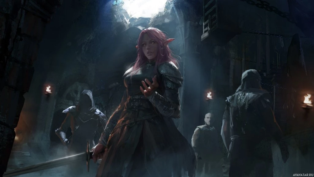 glowing hair and pointed ears who appears to be an elf or fantasy character. This character stands out as the central figure in the composition, holding what looks like a sword. They are surrounded by other figures that seem to be