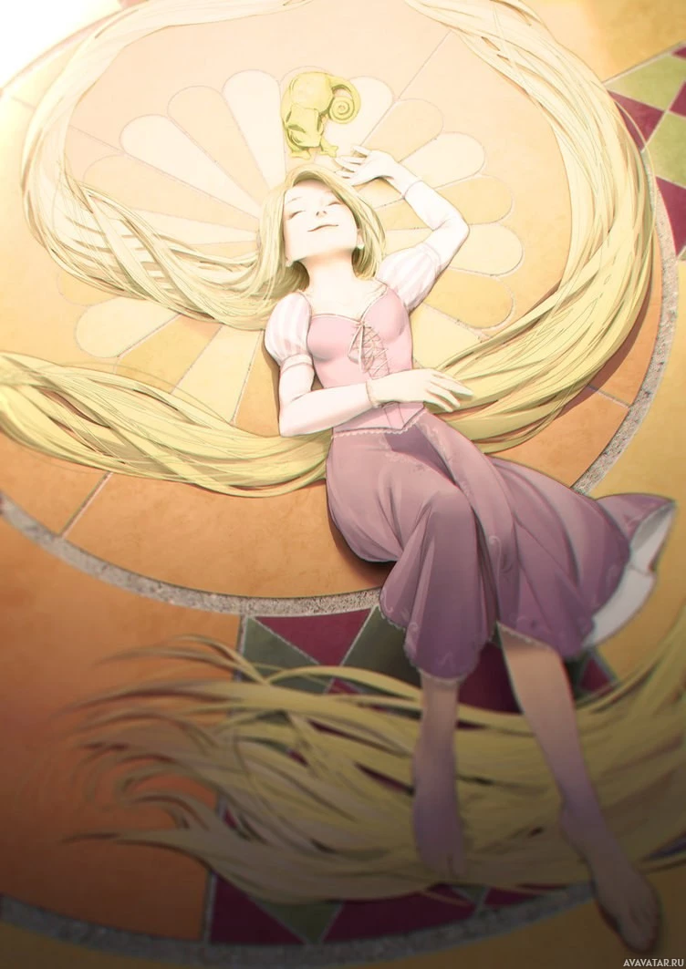blonde hair lying on her back, holding a small bird in one hand. She is dressed in what appears to be a medieval or fantasy-style outfit, and the background suggests she might be resting on a stained