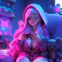 a hooded jacket and is holding a remote control, suggesting she is engaged in a gaming session. Surrounding her are various