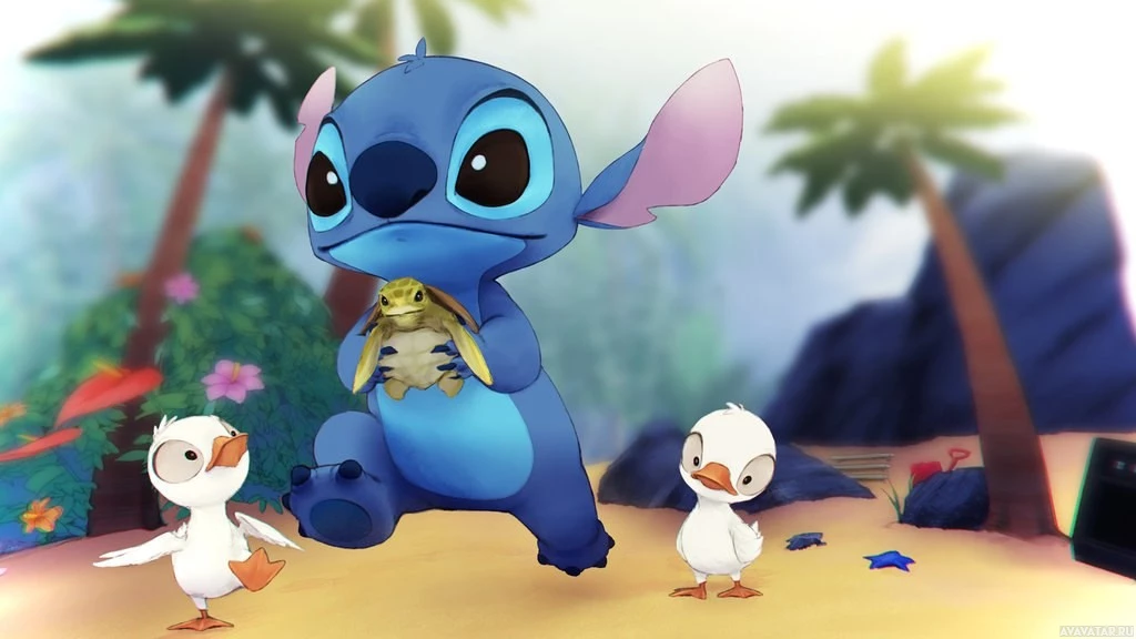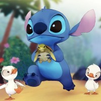 alien character with two black eyes and a white outline resembling Stitch, a well-known character from an animated movie about an alien who lands on Earth. The characters are standing together in what looks like