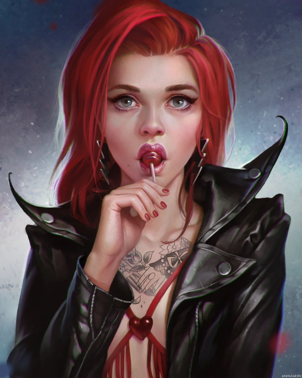 black attire and has tattoos on her arms, suggesting a modern or edgy style. In one hand, she holds a lollipop which she seems to be licking. Her expression is neutral with a hint of contemplation. The background has