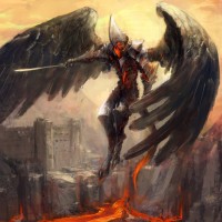 an angelic warrior. This character is standing on what appears to be lava, with