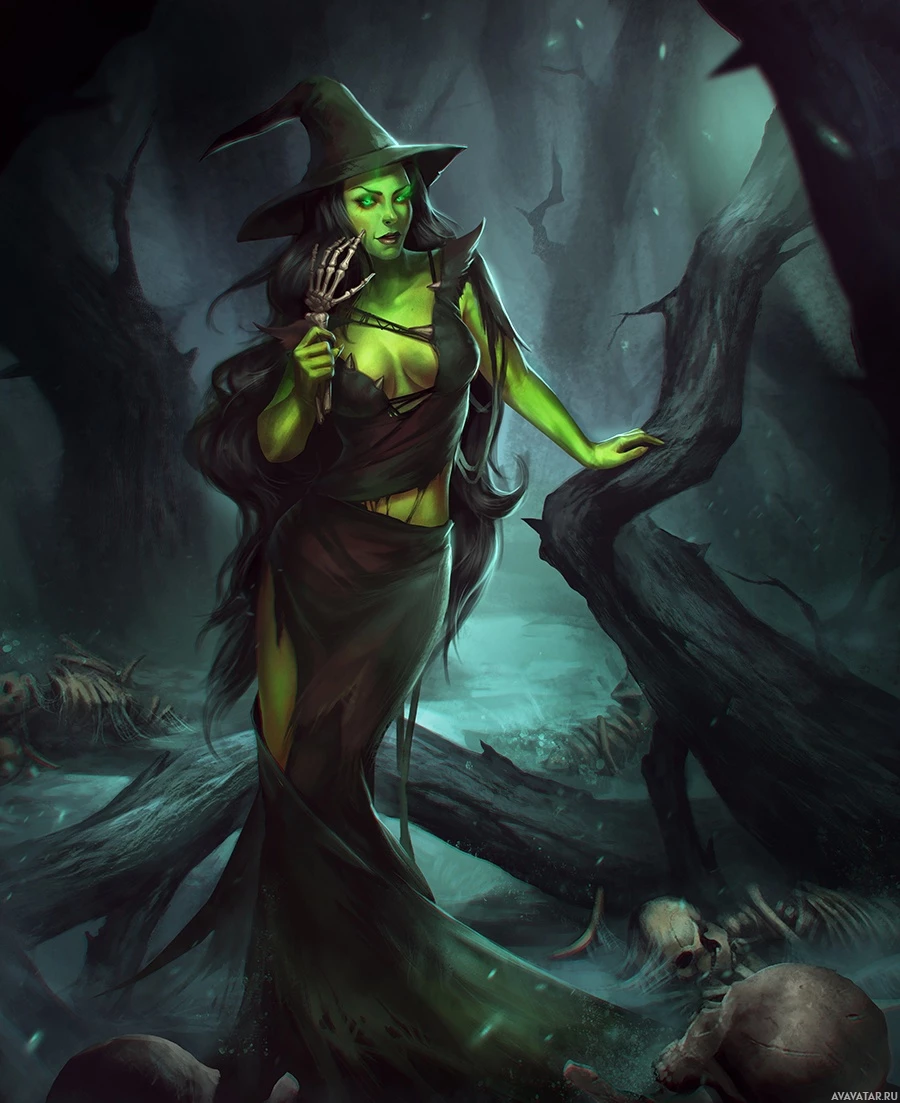 a female figure dressed in a witch costume. She is wearing a long, flowing dress that appears to be green and adorned with gothic or dark elements, such as bones or