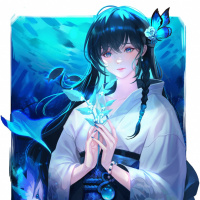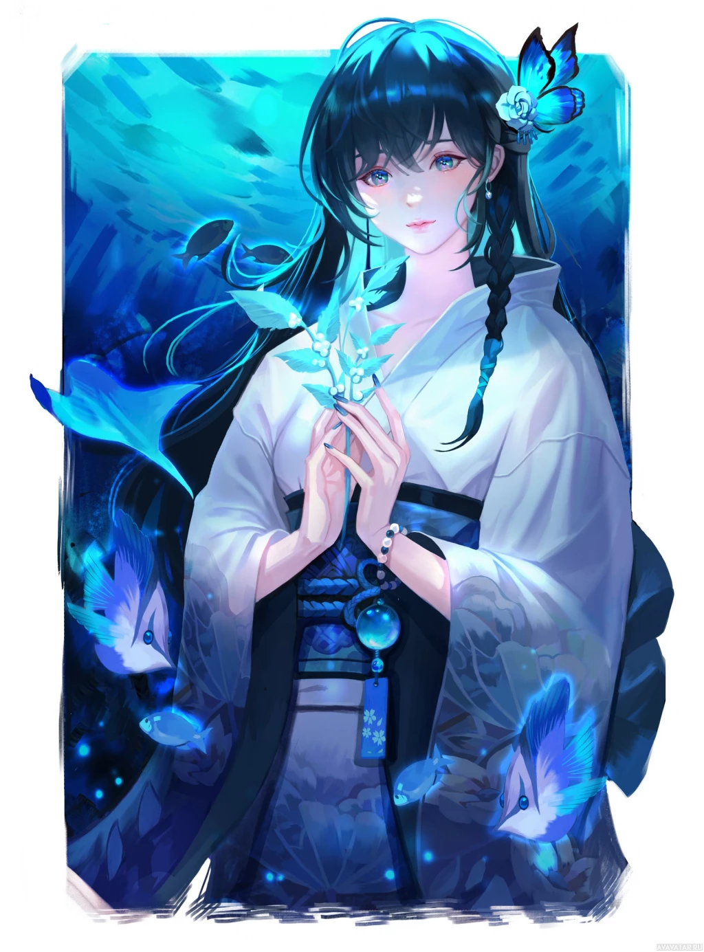 dark hair, wearing traditional Japanese attire. She has blue and black accents on her clothing, suggesting it could be a kimono or similar garment. The artwork features butterflies and other magical elements around her, giving it a fantasy or spiritual theme. The color palette is dominated by