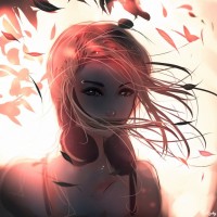 pink hair. She appears to be in a serene, autumnal setting, surrounded by