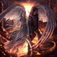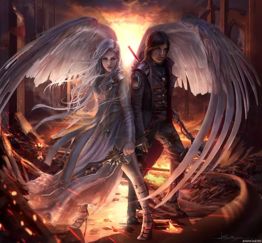 The image depicts two characters who appear to be angels, standing amidst a chaotic and possibly apocalyptic scene. One character is male with dark clothing and