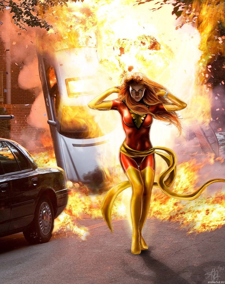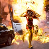 a dynamic pose, with explosions and destruction around her. She is wearing a costume that resembles the character known as "X-Men." The setting appears to be