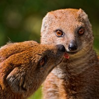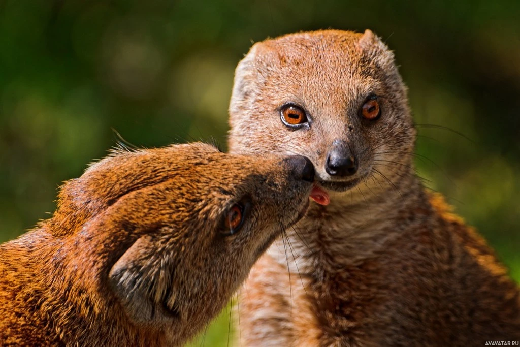 social interaction or bonding behavior. One animal is looking at the camera while the other is turned away. Both animals have pointed ears and