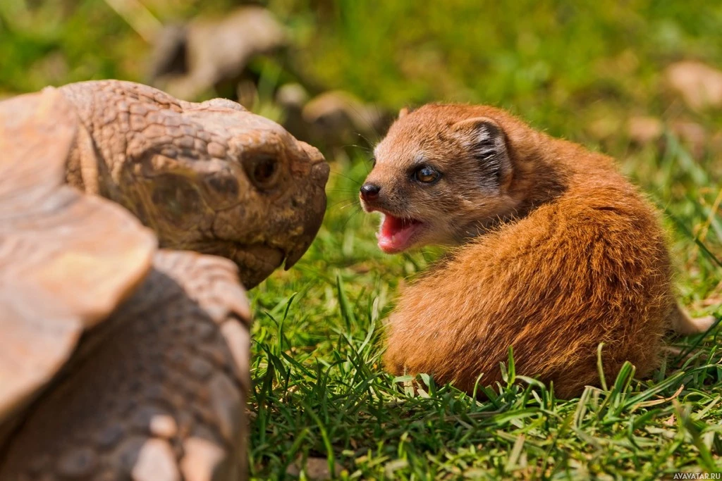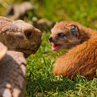 The picture shows a young honey badger (ratel) interacting with an adult tortoise. The honey badger is standing on its hind legs, facing the tortoise, and appears to be sniffing or investigating it closely.
