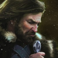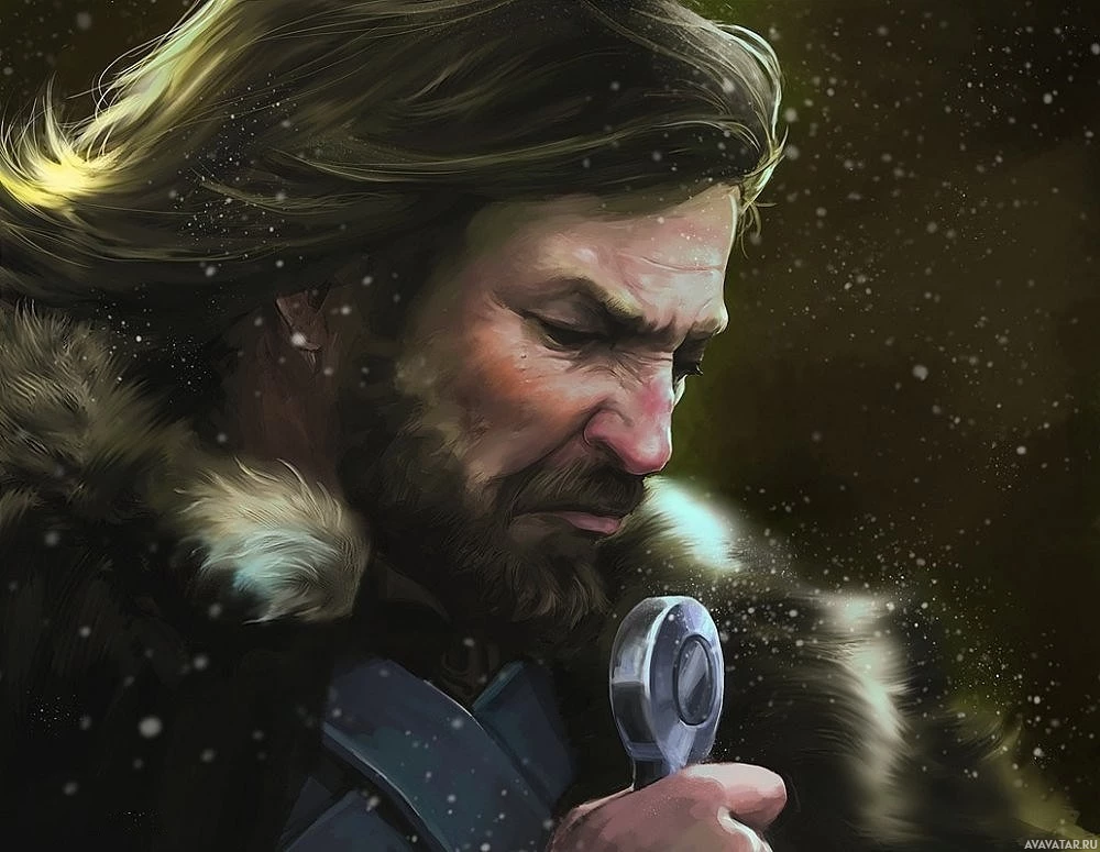 long hair and a beard, wearing what appears to be winter clothing appropriate for cold climates. His expression seems serious or focused as he looks off to the side. The setting suggests it could be