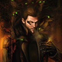 a serious expression. There are also elements in the background that suggest a cyberpunk or