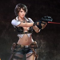 flame effects suggesting that she is in a combat or action-packed scenario. The overall style of the image is reminiscent of