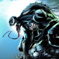 This image features a character known as Spider-Man, specifically in his black symbiotic suit from the comics. The symbiote's typical design includes sharp teeth and is colored with a combination of dark green and black. This costume was famously worn by the character in the "Spider-Man" comic series.