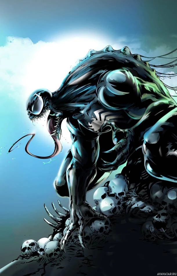 На этом изображении изображен персонаж, известный как Человек-паук, в частности, в его черном симбиотическом костюме из комиксов. Типичный дизайн симбиота включает острые зубы и окрашен в сочетание темно-зеленого и черного. Этот костюм был знаменит тем, что носил персонаж из серии комиксов «Человек-паук».