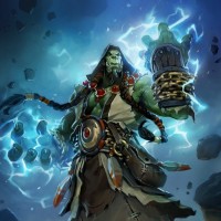 the Warcraft universe. The character appears to be an orc, and he is depicted wielding a staff with