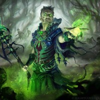 a dark forest or swampy area, with fog and trees in the background, adding to the mystical and ominous atmosphere of the scene.