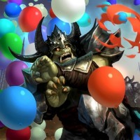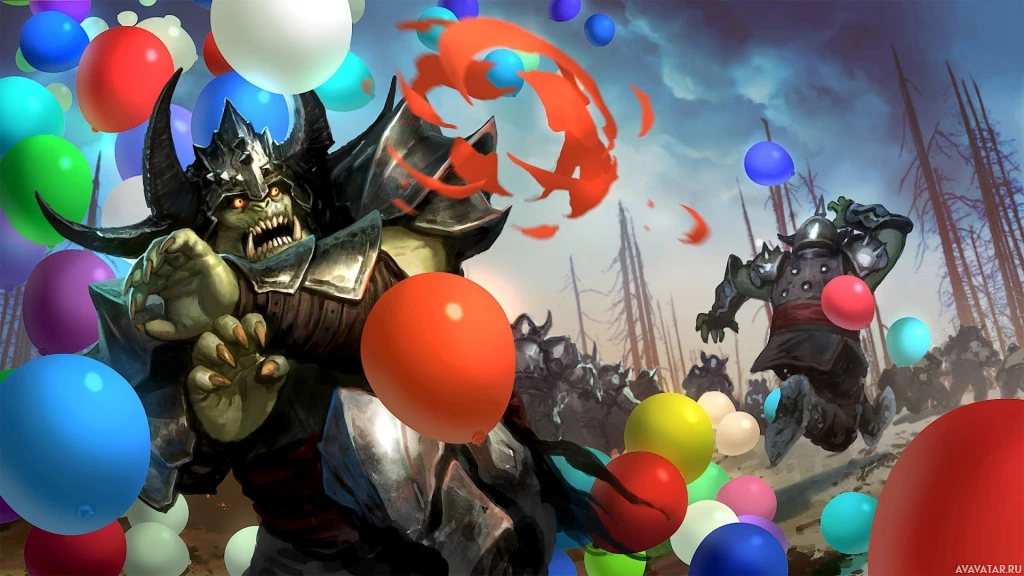 a fantasy scene featuring an orc character, which is a common term in the world of fantasy for a type of mythical creature often depicted as warlike and intelligent. In this illustration, the orc appears to be celebrating with balloons that are floating around it. It's set against a backdrop that looks like a battlefield with other