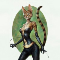 cat character. This character has human-like features, including standing upright and wearing a costume that resembles that of a superhero or a vigilante. The character is set against