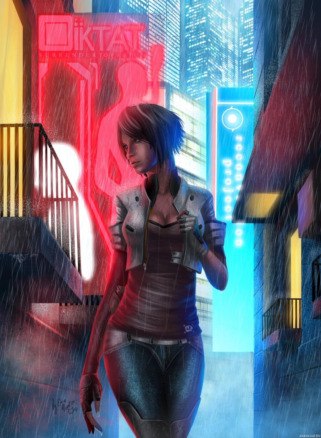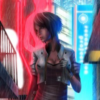 a futuristic setting or theme. The background features neon signs and advertisements, giving the impression of a bustling