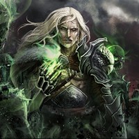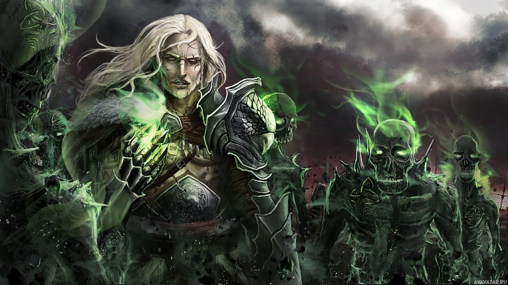 white hair and intricate clothing. This character is casting a green spell with one hand while holding a staff in the other, suggesting they are using magic to summon or control entities that resemble zombies or