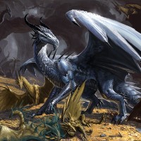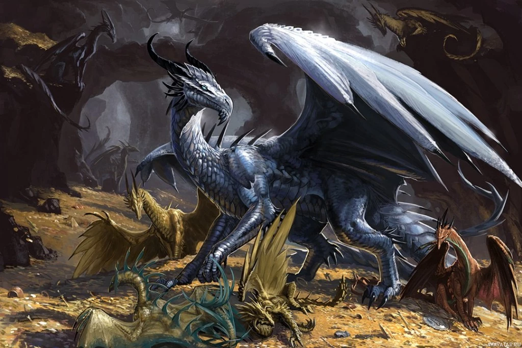 fantasy creatures that could be interpreted as witches or other mystical characters. The dragon's wings are spread wide and its scales have