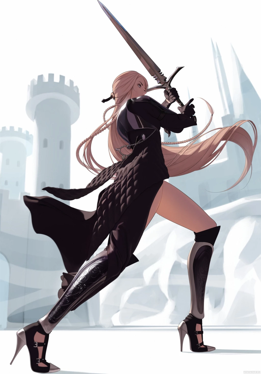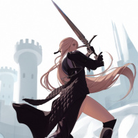 blonde hair and is holding a sword in her right hand. Her outfit consists of armor, including a skirt with