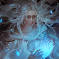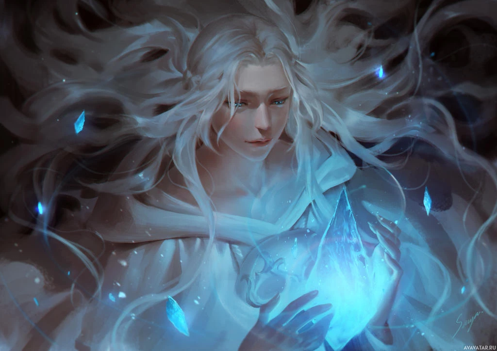 white hair and long flowing locks. She has an ethereal appearance, holding what appears to be