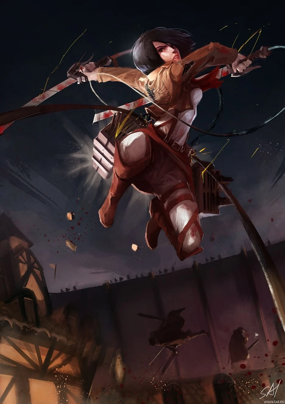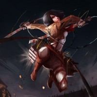 a female character wielding a sword. She appears to be in action, possibly performing a leap or strike. In the background, there's