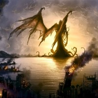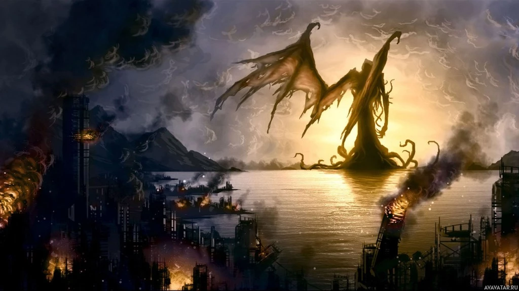 the fantasy genre with elements inspired by Cthulhu. It shows a city under attack with buildings being destroyed and a dark,