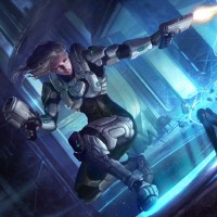 a futuristic environment, possibly part of a spacecraft or a battlefield. The image conveys