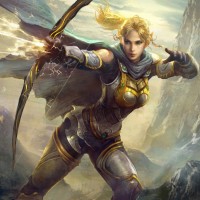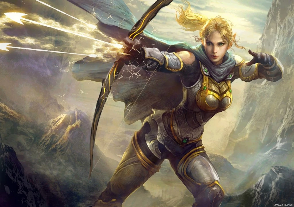 a fantasy character, which appears to be an elf archer. She is holding a bow in one hand and has the other hand raised as if she's about to release an arrow or casting a spell. The character is wearing armor with a helmet featuring