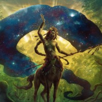 In the image, there is a figure that appears to be a fantastical or mythological being. This figure has both human and animal features, with
