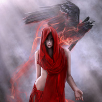 dark background, possibly storm clouds, which adds to the dramatic atmosphere. There is a large crow or raven perched atop her shoulder, looking towards