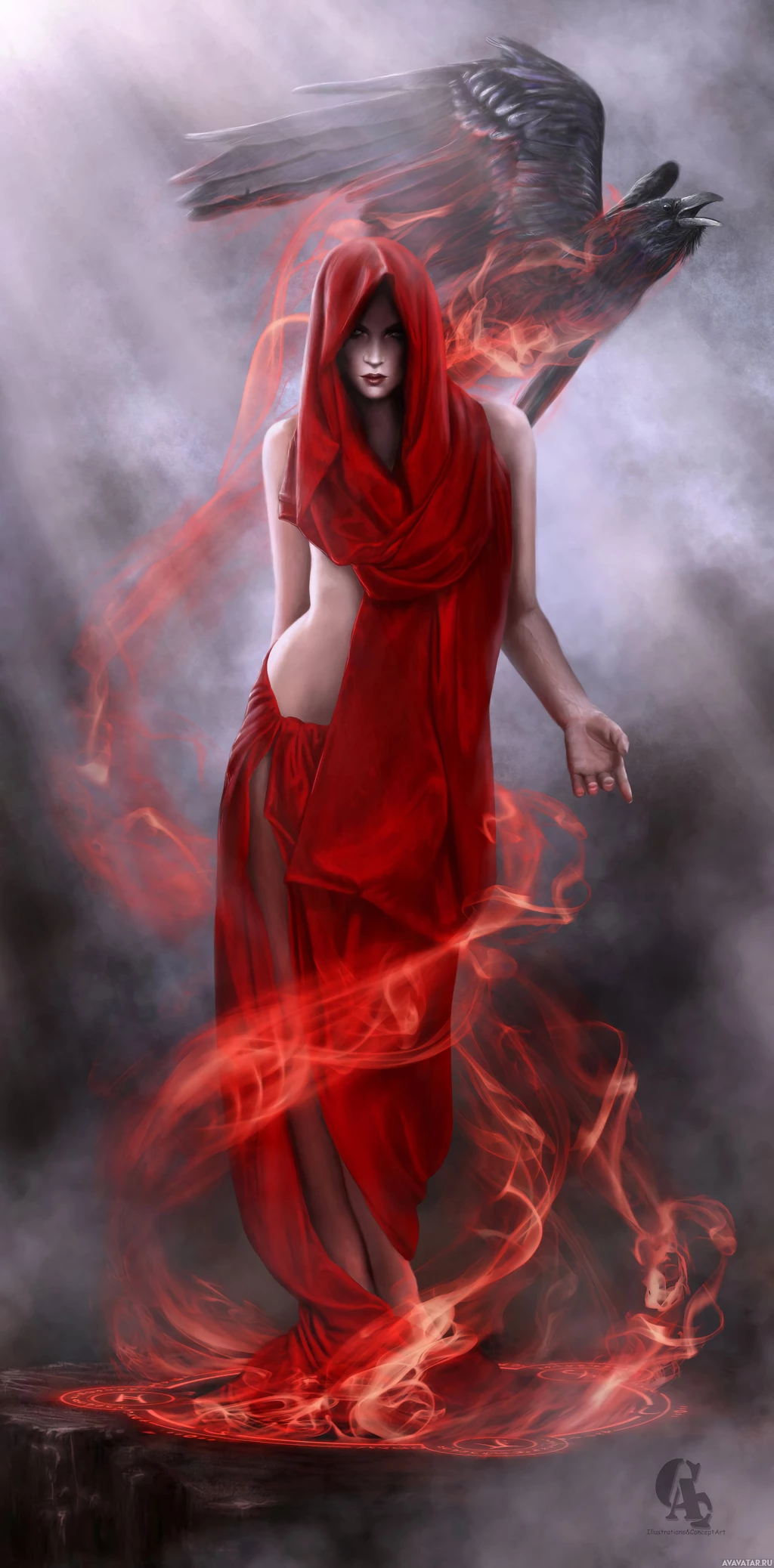 something in the distance. The bird's presence suggests a connection to magic or mystical themes often associated with such creatures in fantasy literature and folklore. The artwork is rich in detail, indicating that it might be from a larger narrative or conceptual series. There are hints of magical elements, such as the glowing red energy emanating from her hand and flowing into the ground beneath her, which adds to the mystical atmosphere. The overall mood of the image is dark yet dynamic, with a sense of power and otherworldly allure.