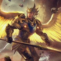 The image depicts a fantasy-themed character that appears to be an angel. The character is wearing armor and has wings, which are traditional characteristics of an angel in mythology or fantasy stories. The setting suggests a chaotic