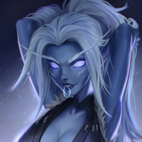 fantasy lore. The character is wearing what appears to be armor or a bodysuit that accentuates her form. Her expression is serious and intense, giving off a strong