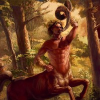 The image features a fantastical depiction of a centaur, which is a mythological creature with the upper body of a human and the lower body of a horse. The centaur is shown riding on the back of a forest scene, holding what appears to be a ram's horn. The art style suggests it could be from a classical or mythological narrative.