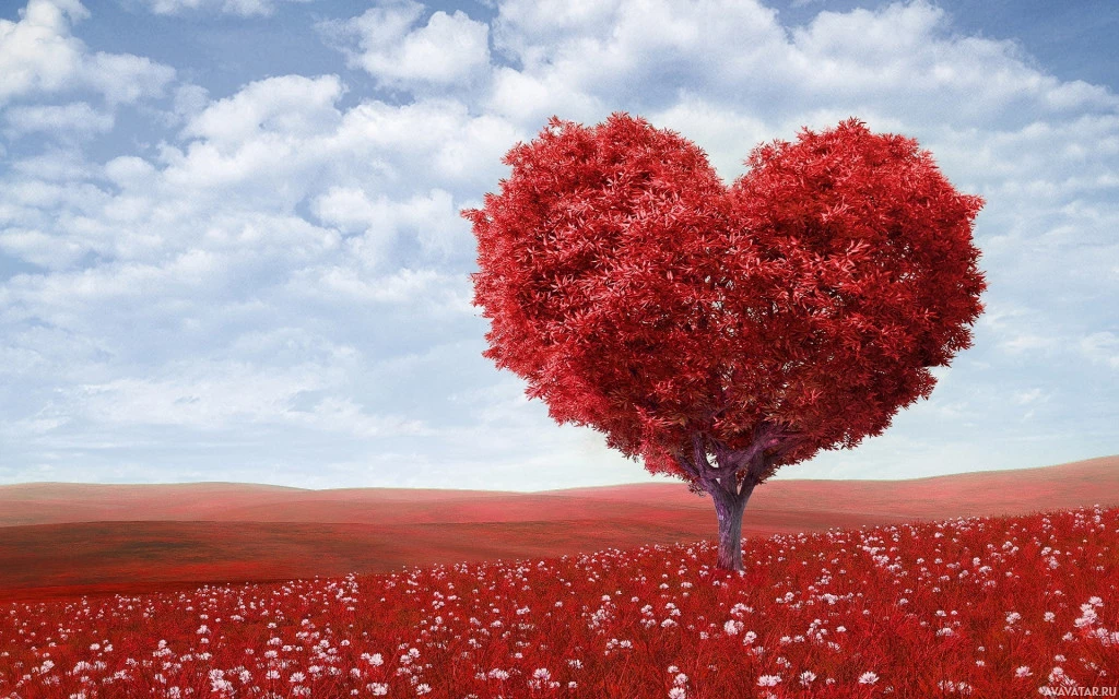 shaped tree prominently positioned in the center. The tree is surrounded by fields of vibrant
