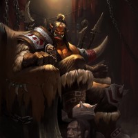 The image depicts a fantasy-themed scene featuring an orc sitting on a throne. The setting appears to be dark and dank, with chains and skulls, suggesting