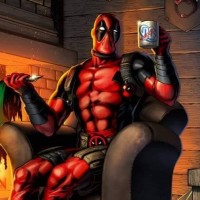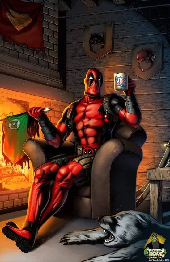 The image shows a character, Deadpool, sitting in what appears to be a cozy