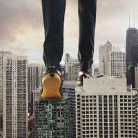 urban environment, possibly Chicago, given its distinctive tall buildings and grid-like street layout. The person's feet are clearly visible, as they stand confidently on what appears to be