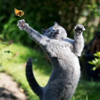 The image shows a gray cat reaching up with its paws towards a butterfly. It appears to be an outdoor setting, possibly a garden or park, with plants and flowers around. The cat's posture and the position of its paws suggest it is trying to catch or interact with the butterfly.