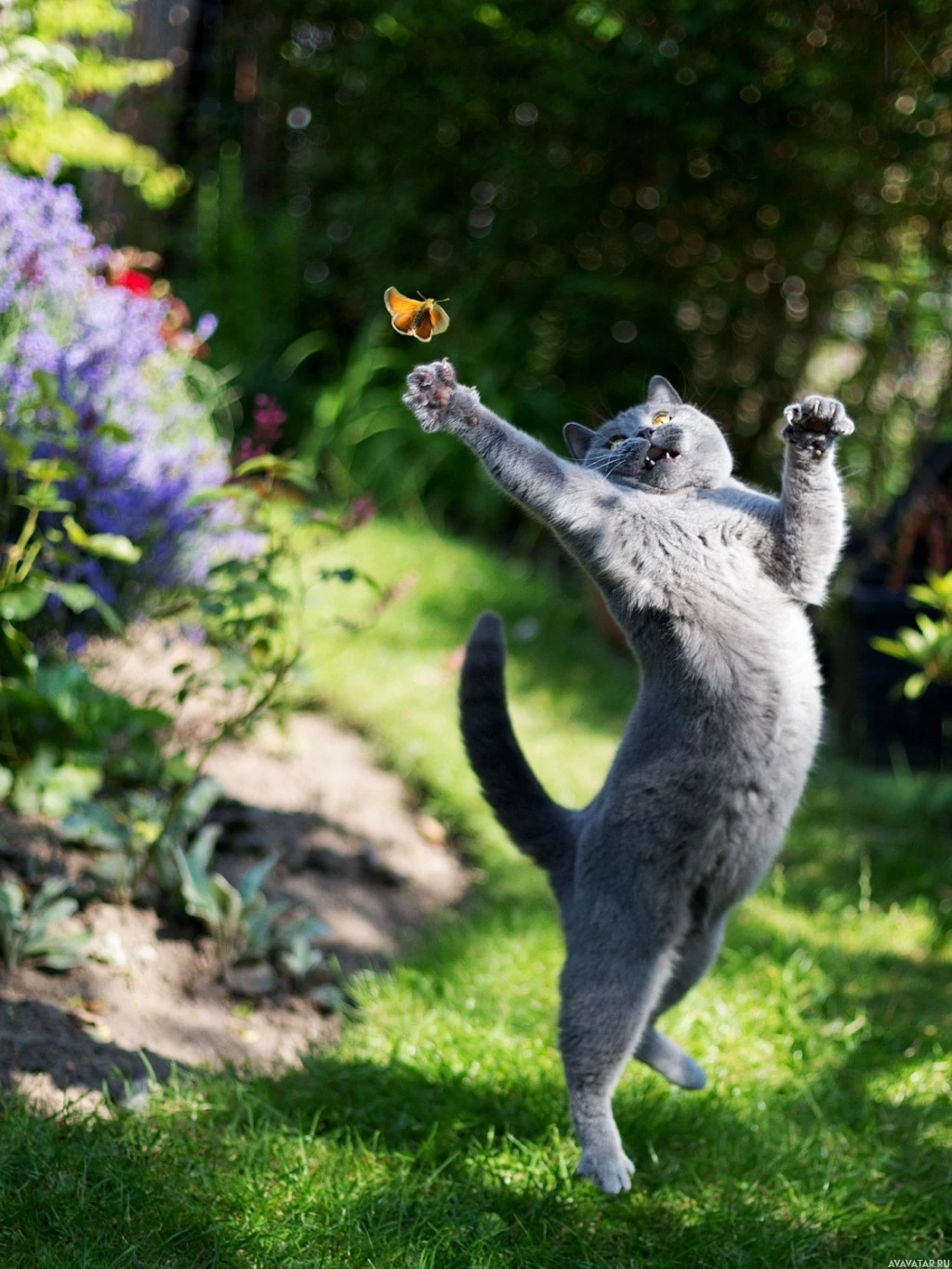 Картинка показывает серую кошку, подтягивающуюся лапами к бабочке. Это, кажется, наружная обстановка, возможно, сад или парк, с растениями и цветами вокруг. Поза кошки и положение ее лап предполагают, что она пытается поймать или взаимодействовать с бабочкой.