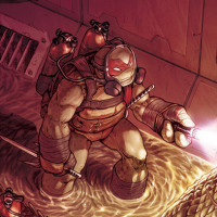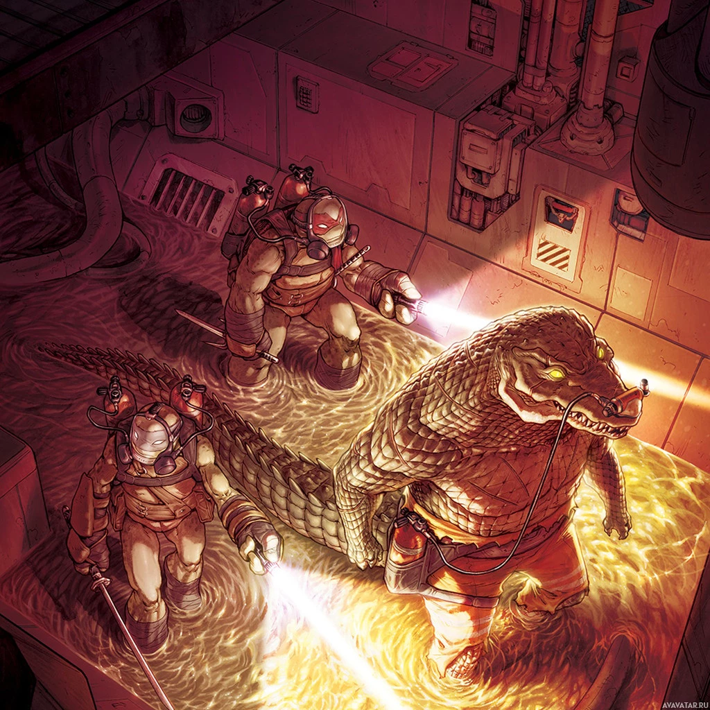 comic book-like scene featuring anthropomorphic crocodiles wearing uniforms and protective gear, reminiscent of the Teenage Mutant Ninja Turtles. They are standing in
