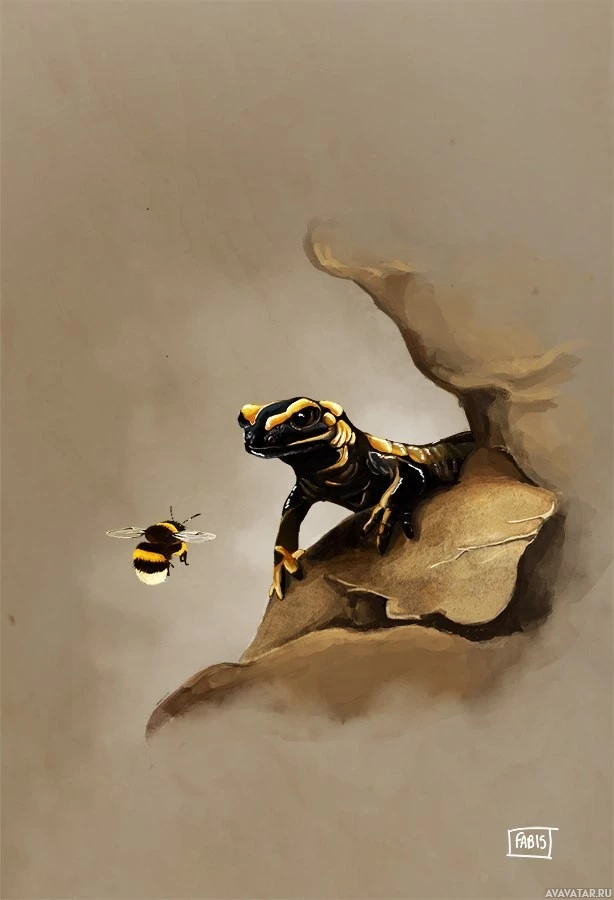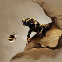 a natural environment that looks like it could be a rocky outcropping with some vegetation around. There's also a bumblebee hovering close to the iguana, which adds an element of interaction between